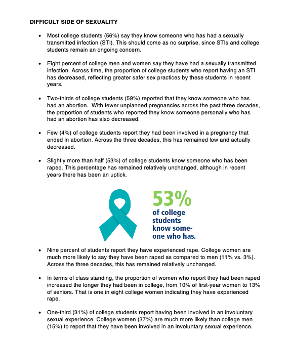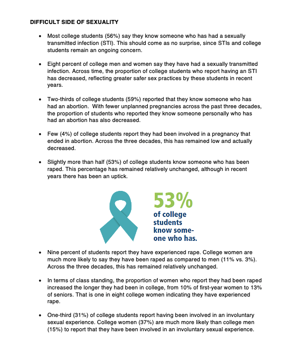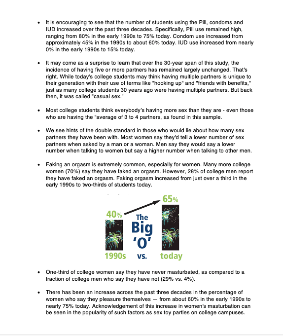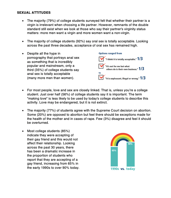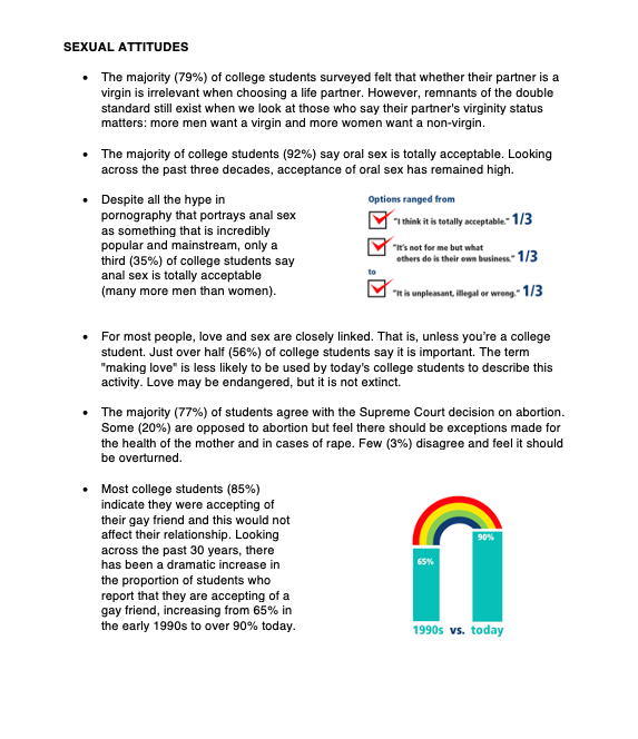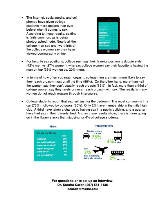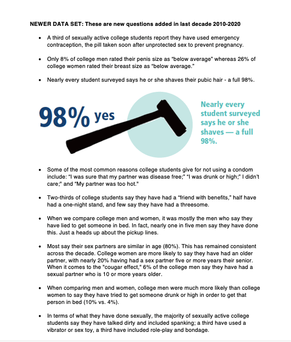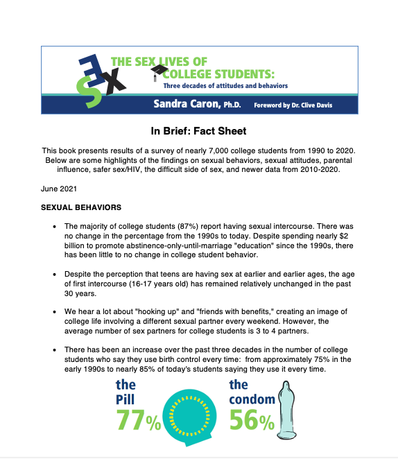 "Sandy Caron’s book, Sex Lives of College Students: Three Decades of Attitudes and Behaviors, is a MUST read for anyone who teaches college human sexuality classes or provides sexual health services to college students. This unique and amazing 30-year snapshot of sexuality-related attitudes and behaviors of nearly 5000 college students at one university shows important trends that can inform the development of more relevant sexuality education and services and the discussion of sexuality and cultural changes. Conveying the findings to students can provoke not only discussion of sexuality issues dominant to college students from yesterday to today but also can lead to students being reflective about their own sexuality. Certainly I will share the findings with my human sexuality students. I applaud and thank Dr. Caron for her foresight and perseverance in conducting this valuable annual survey for the past 30 years. I hope Dr. Caron continues this study and to all early-career sexuality educators, I challenge you to begin your own annual survey—believe me, before you know it you will have several decades of trend data that also will be valuable to human sexuality students and professionals."